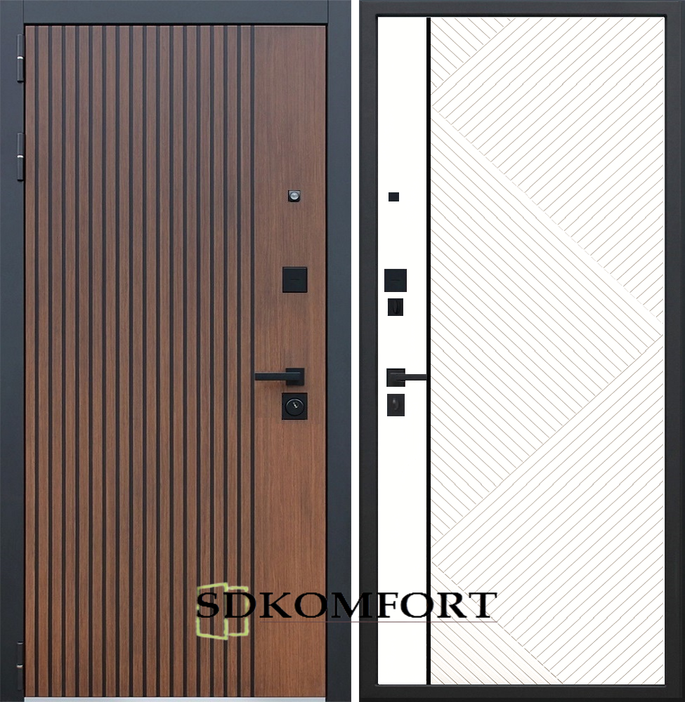 Фурнитура : Броненакладка врезная, накладка со шторкой, глазок , дверная ручка, ночная задвижка. Цилиндр ключ-вертушка, регулируемый эксцентрик.