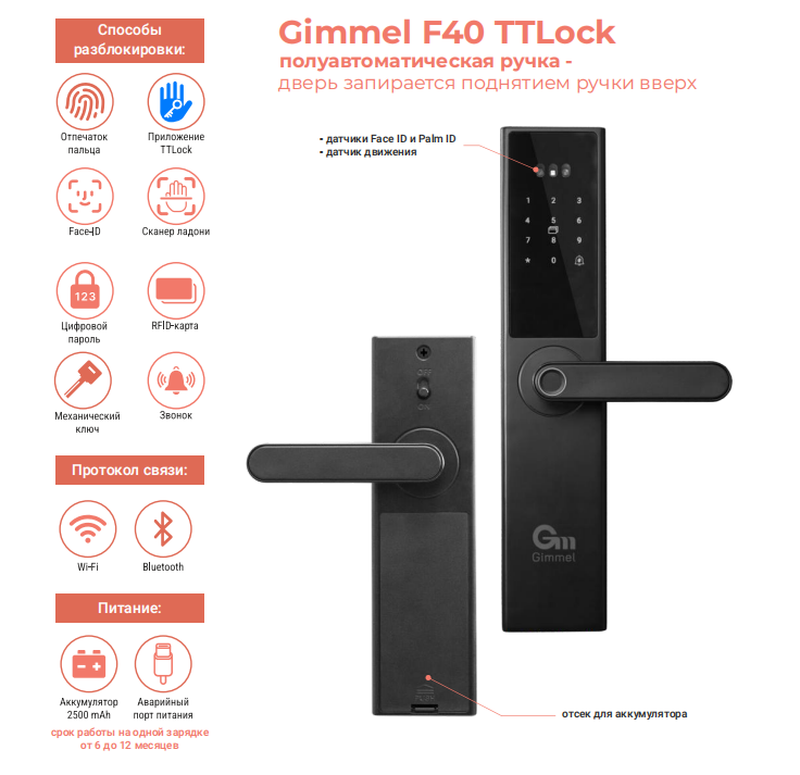 Способы разблокировки: отпечаток пальца, цифровой пароль, смартфон, RFID карта, механический ключ